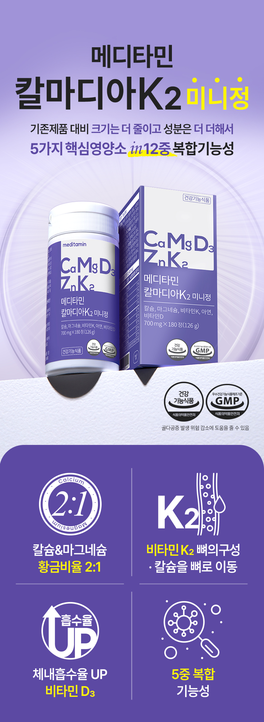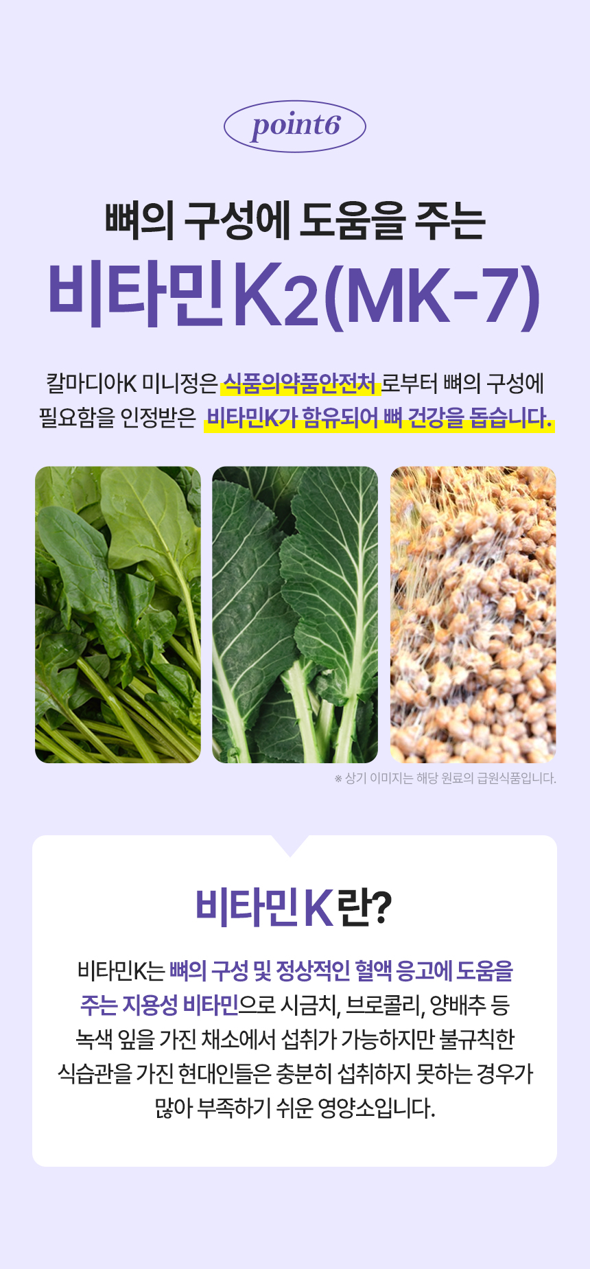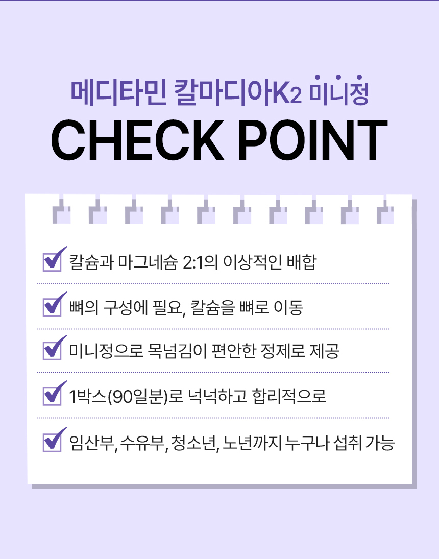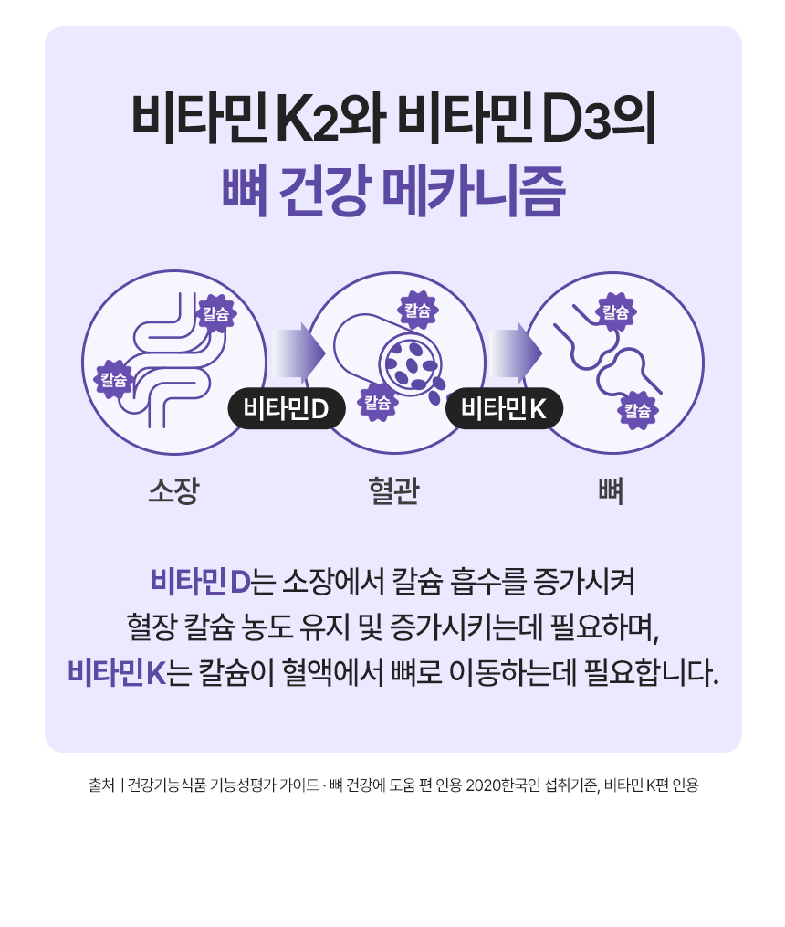 | 기능정보 | [칼슘] 뼈와 치아 형성에 필요, 신경과 근육 기능 유지에 필요, 정상적인 혈액응고에 필요, 골다공증 발생 위험 감소에 도움을 줌 [마그네슘] 에너지 이용에 필요, 신경과 근육 기능 유지에 필요 [비타민K] 정상적인 혈액응고에 필요, 뼈의 구성에 필요 [아연] 정상적인 면역 기능에 필요, 정상적인 세포 분열에 필요 [비타민D] 칼슘과 인이 흡수되고 이용되는데 필요, 뼈의 형성과 유지에 필요, 골다공증발생 위험 감소에 도움을 줌 | ||