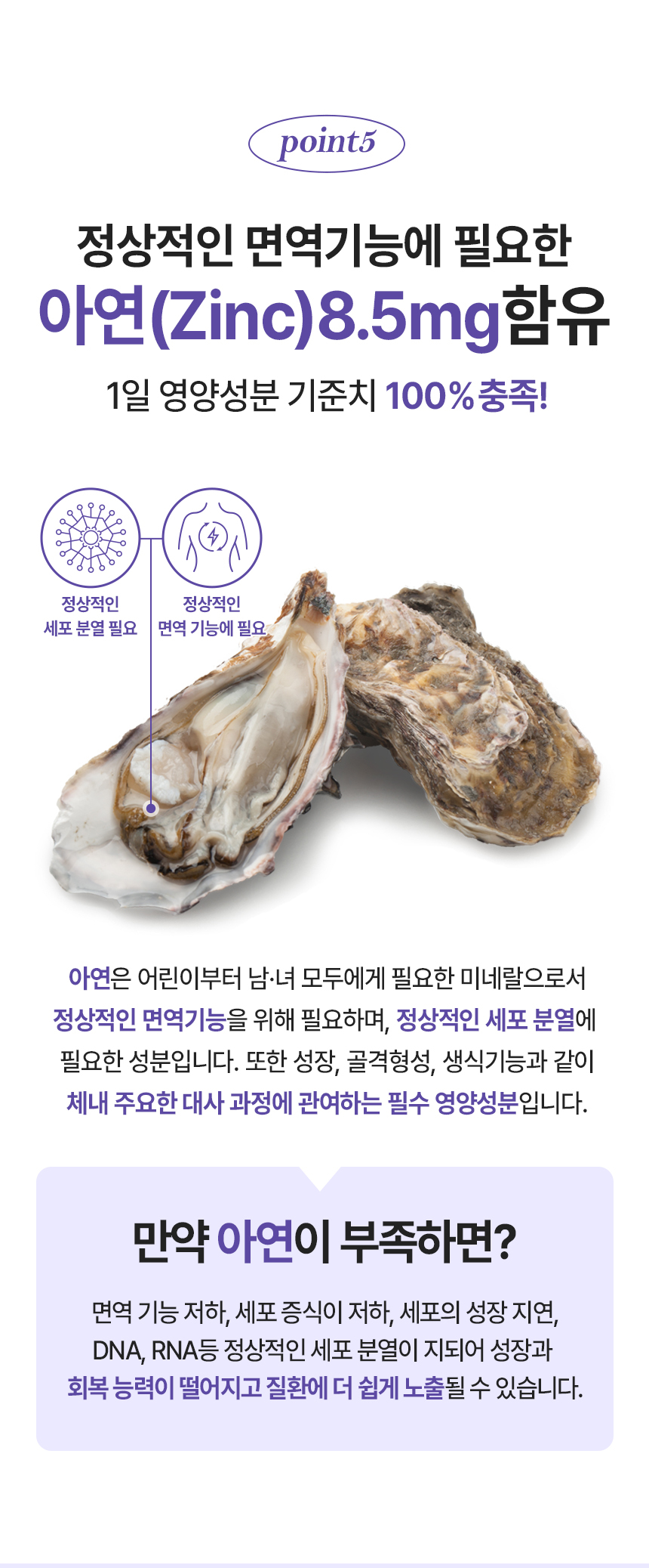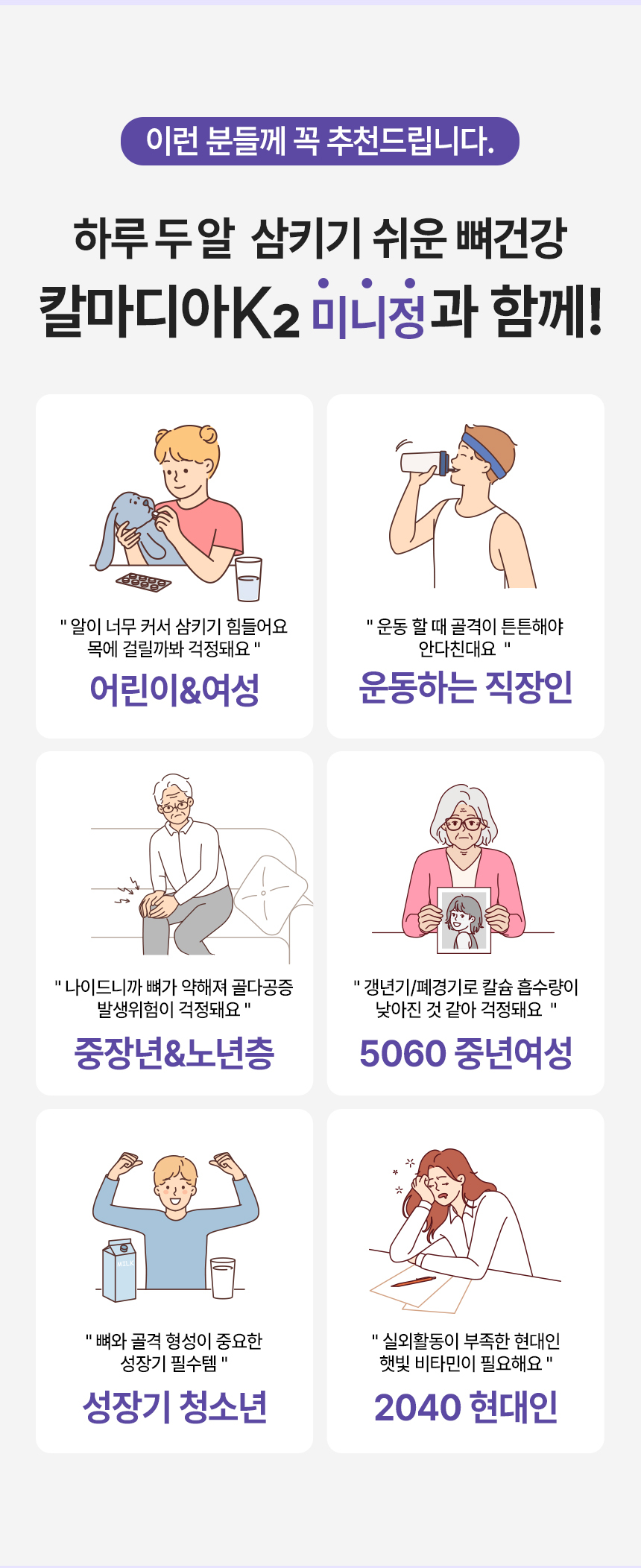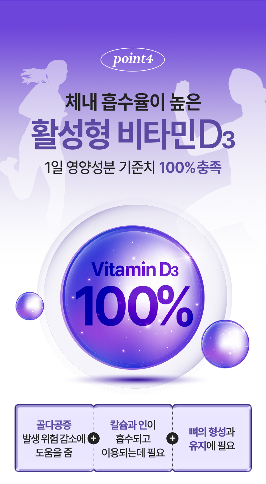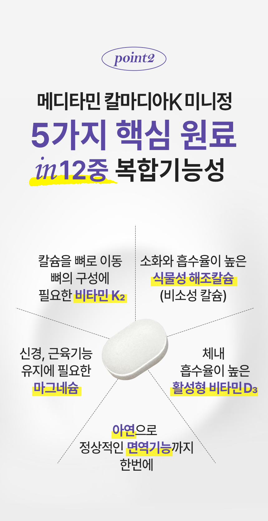 | 기능정보 | [칼슘] 뼈와 치아 형성에 필요, 신경과 근육 기능 유지에 필요, 정상적인 혈액응고에 필요, 골다공증 발생 위험 감소에 도움을 줌 [마그네슘] 에너지 이용에 필요, 신경과 근육 기능 유지에 필요 [비타민K] 정상적인 혈액응고에 필요, 뼈의 구성에 필요 [아연] 정상적인 면역 기능에 필요, 정상적인 세포 분열에 필요 [비타민D] 칼슘과 인이 흡수되고 이용되는데 필요, 뼈의 형성과 유지에 필요, 골다공증발생 위험 감소에 도움을 줌 | ||