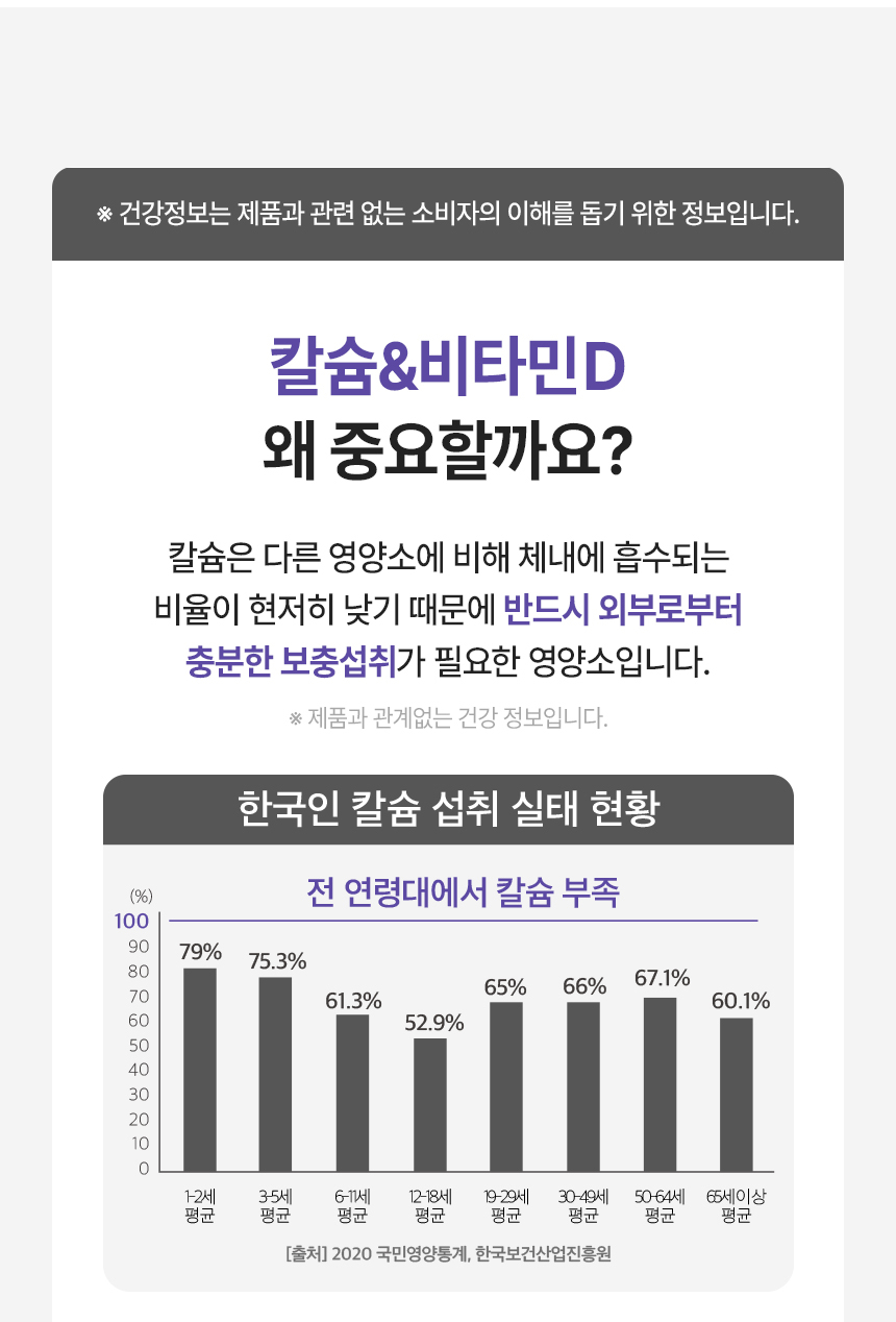 | 소비자안전을 위한 주의사항 | 특정질환, 특이체질, 알레르기체질, 임산부의 경우에는 간혹 개인에 따라 과민반응이 나타날 수 있으므로 원료를 확인하시고, 섭취 전에 전문가와 상담 하십시오. 원료의 특성에 따라 색상이 변할 수 있으나 품질에는 영향이 없는 자연스러운 현상이므로 안심하고 섭취하십시오. 항응고제 등 복용 시 전문가와 상담하십시오. 이상사례 발생 시 섭취를 중단하고 전문가와 상담하십시오. 고칼슘혈증이 있거나 의약품 복용 시 전문가와 상담하십시오. | ||