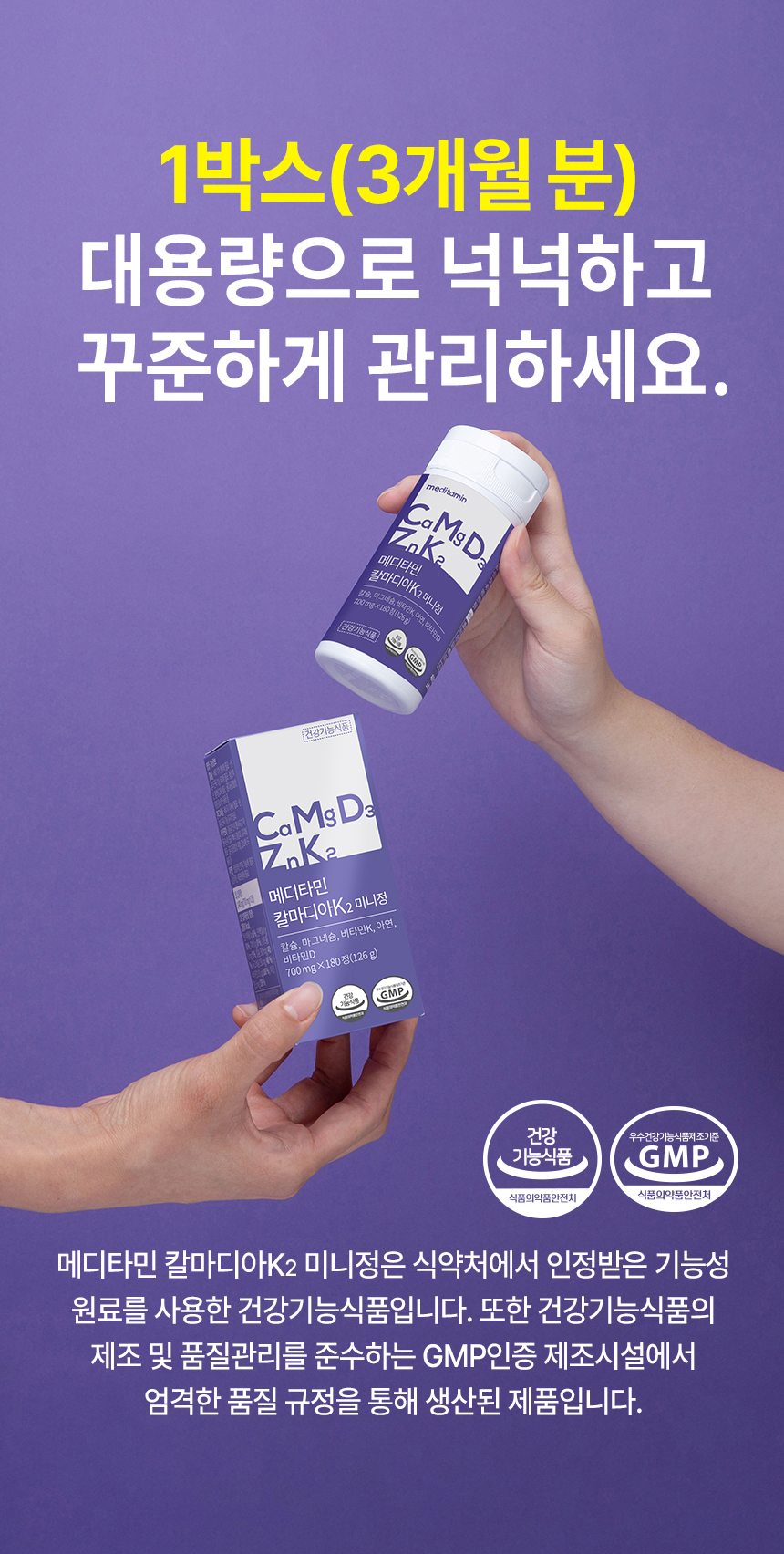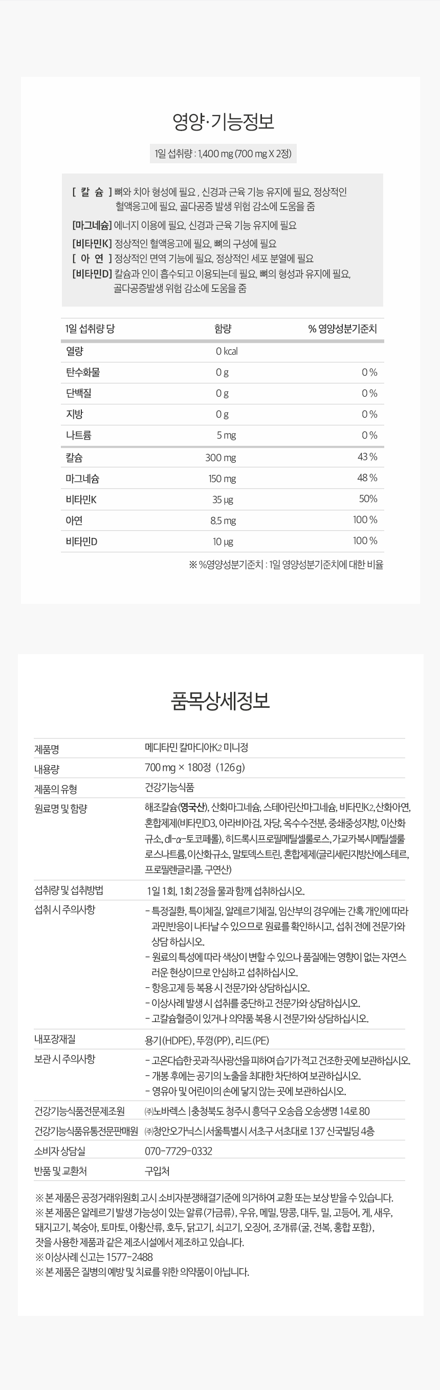 | 원재료명 및 함량(농수산물의 원산지 표시에 관한 법률에 따른 원산지 표시 포함) | 해조칼슘(영국산), 산화마그네슘, 스테아린산마그네슘, 비타민K2, 산화아연, 혼합제제(비타민D3, 아라비아검, 자당, 옥수수전분, 중쇄중성지방, 이산화규소, dl-a-토코페롤), 히드록시프로필메틸셀룰로스, 가교카복시메틸셀룰로스나트륨, 이산화규소, 말토덱스트린, 혼합제제(글리세린지방산에스테르, 프로필렌글리콜, 구연산) | ||